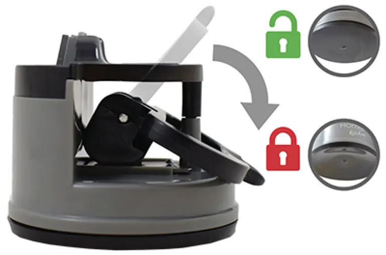 Una vez fijada la ventosa, puede afilar cualquier cuchillo con seguridad utilizando una sola mano y manteniendo la mano libre protegida de posibles daños.