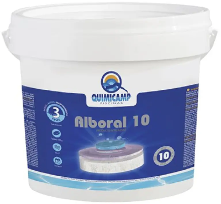 Producto para el perfecto mantenimiento del agua de la piscina con acción desinfectante, algicida, floculante, estabilizante, mantenedor de pH, bactericida, abrillantador, anticalcáreo, bacteriostático y clarificante