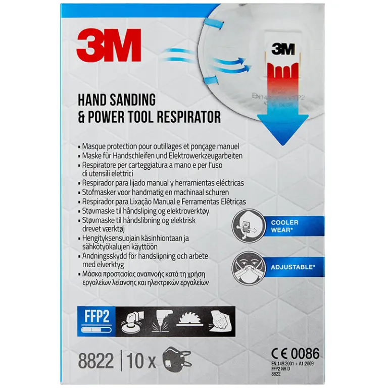 Clase 2) protege frente a niveles medios de polvo fino y neblinas con base de aceite o agua, que suelen producirse en tareas como pulir y lijar con herramientas eléctricas, taladrar y cortar materiales pintados o barnizados, cemento, madera y acero