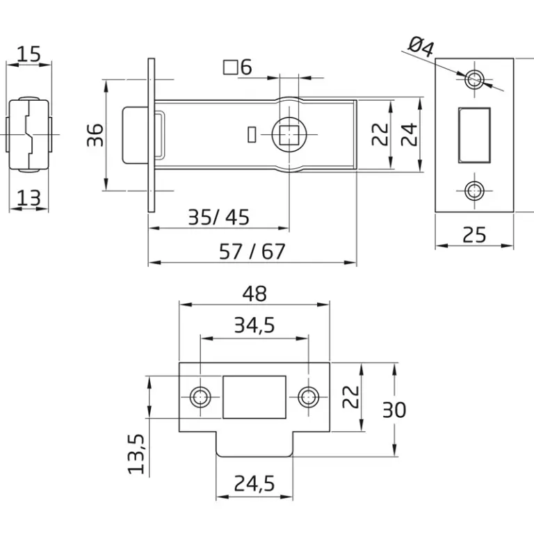 Picaporte de embutir de entrada 35 mm con el frente y el soporte en canto cuadrado.