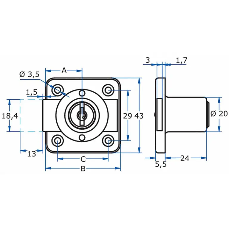Medidas: A=25mm, B=48mm, C=34mm
