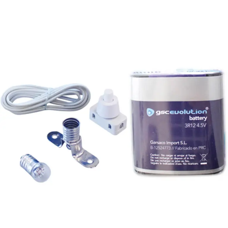 Incluye:Portalámparas, bombilla 4V (0.4A), interruptor 250V (2A), pila 3R12 4.5V, cable conexión 1M
