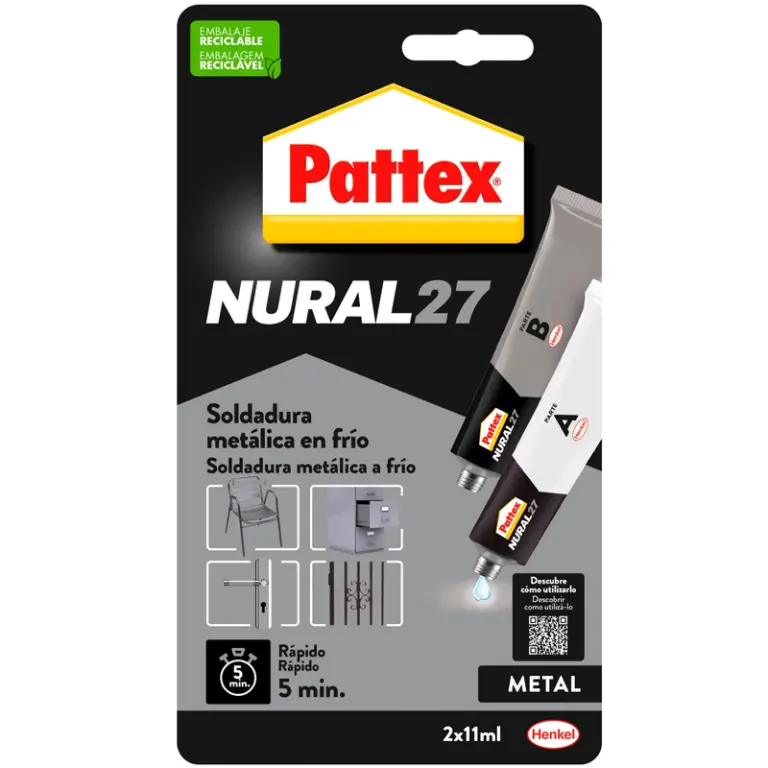 Pattex Nural 27 es una soldadura reparadora en frío, rápida (5 minutos), de gran resistencia, formulada en especial para pegar y reparar metales