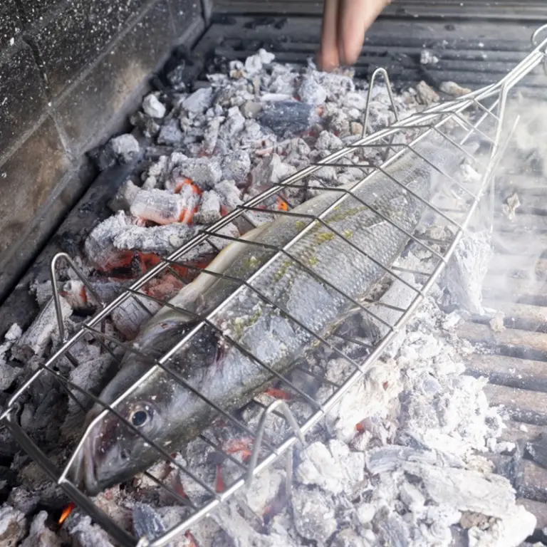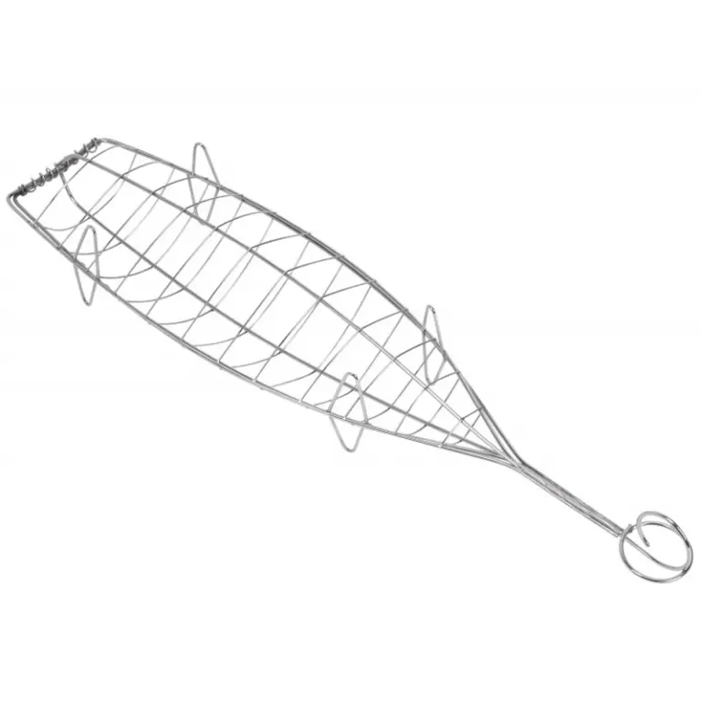 Parrilla doble abombada con forma de pescado que permite la cocción cómoda y segura de piezas enteras de pescado
