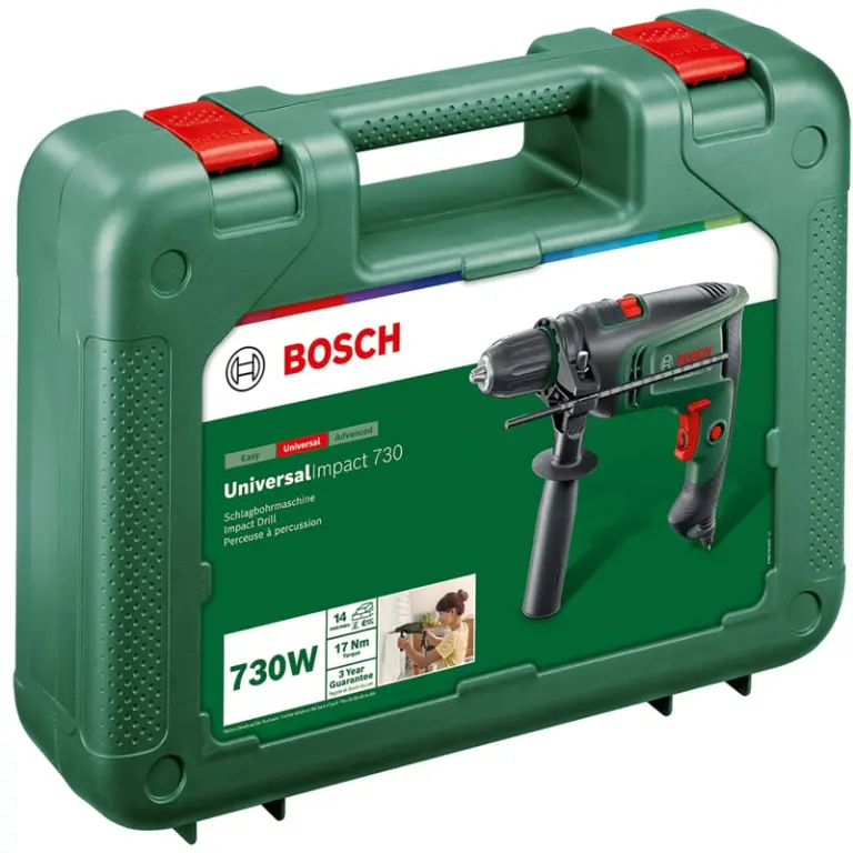 Taladro percutor Universal Impact 730, empuñadura adicional, tope de profundidad y maletín de transporte.