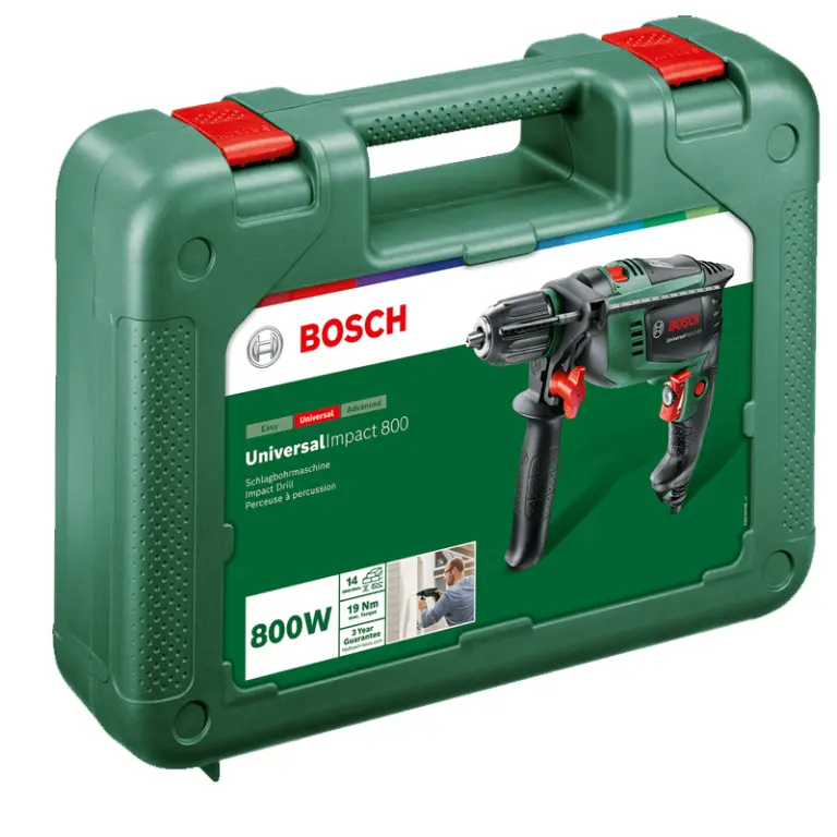 Taladro percutor Universal Impact 800, empuñadura adicional, tope de profundidad y maletín de transporte.