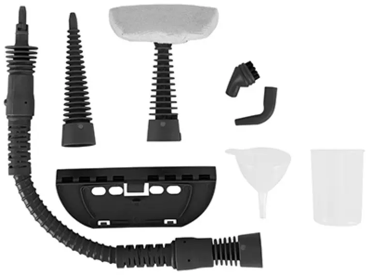 9 accesorios: Tubo flexible, boquilla cónica, accesorio para superficies lisas, accesorio para cristales, paño, cepillo redondo, boquilla inclinada, embudo y vaso medidor.